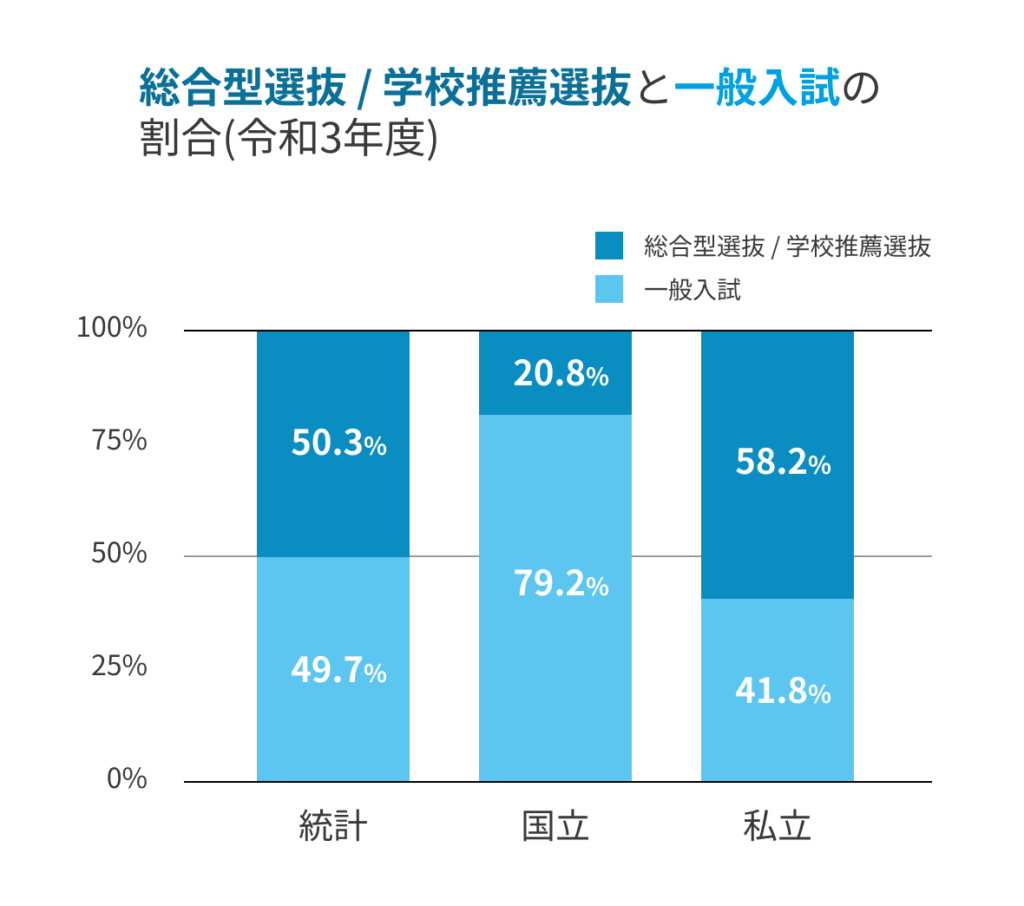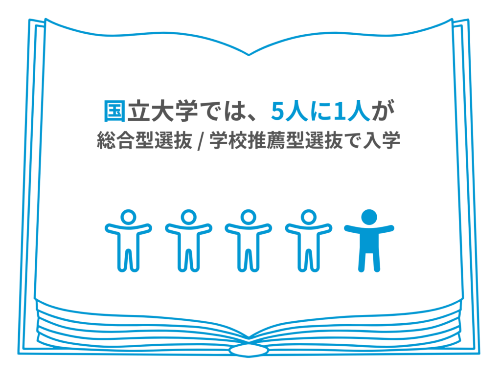 令和5年度は、国立大学では5人に1人、私立大学では 1.7人に1人が、総合型選抜 / 学校推薦型選抜で入学しています。